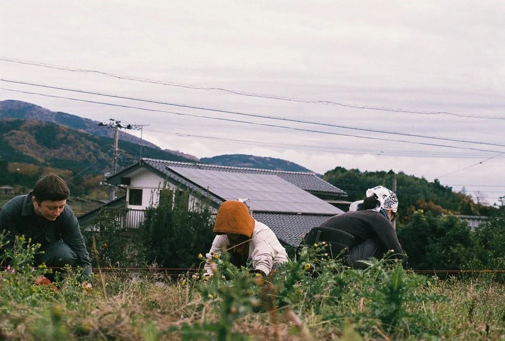 Between the fruits of an organic mikan orchard, the three artists went about weeding, cutting, and scattering the discarded plants over randomly thrown Japanese vegetable seeds. This randomized seeding method, combined with weed mulching, aimed to explore alternatives to mechanised and highly controlled farming practices present in other agricultural methods.