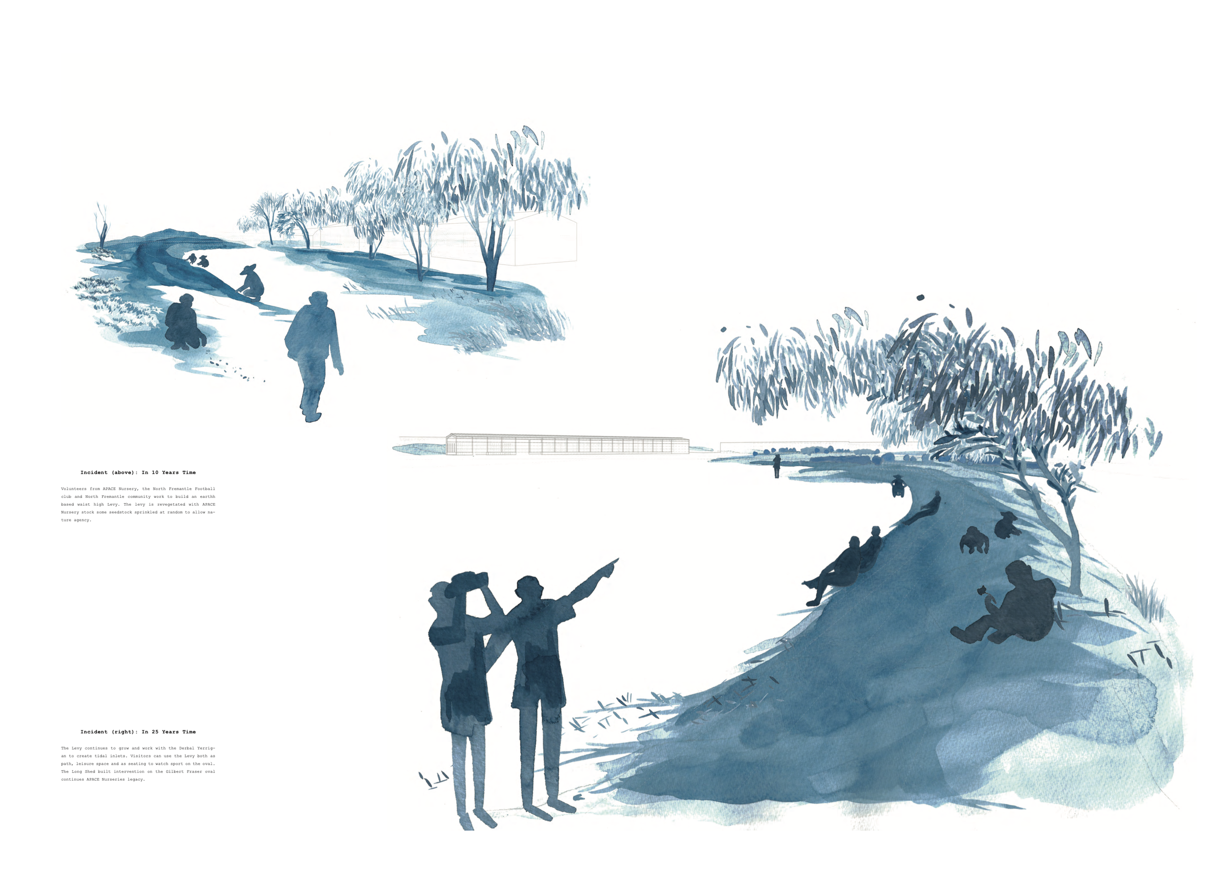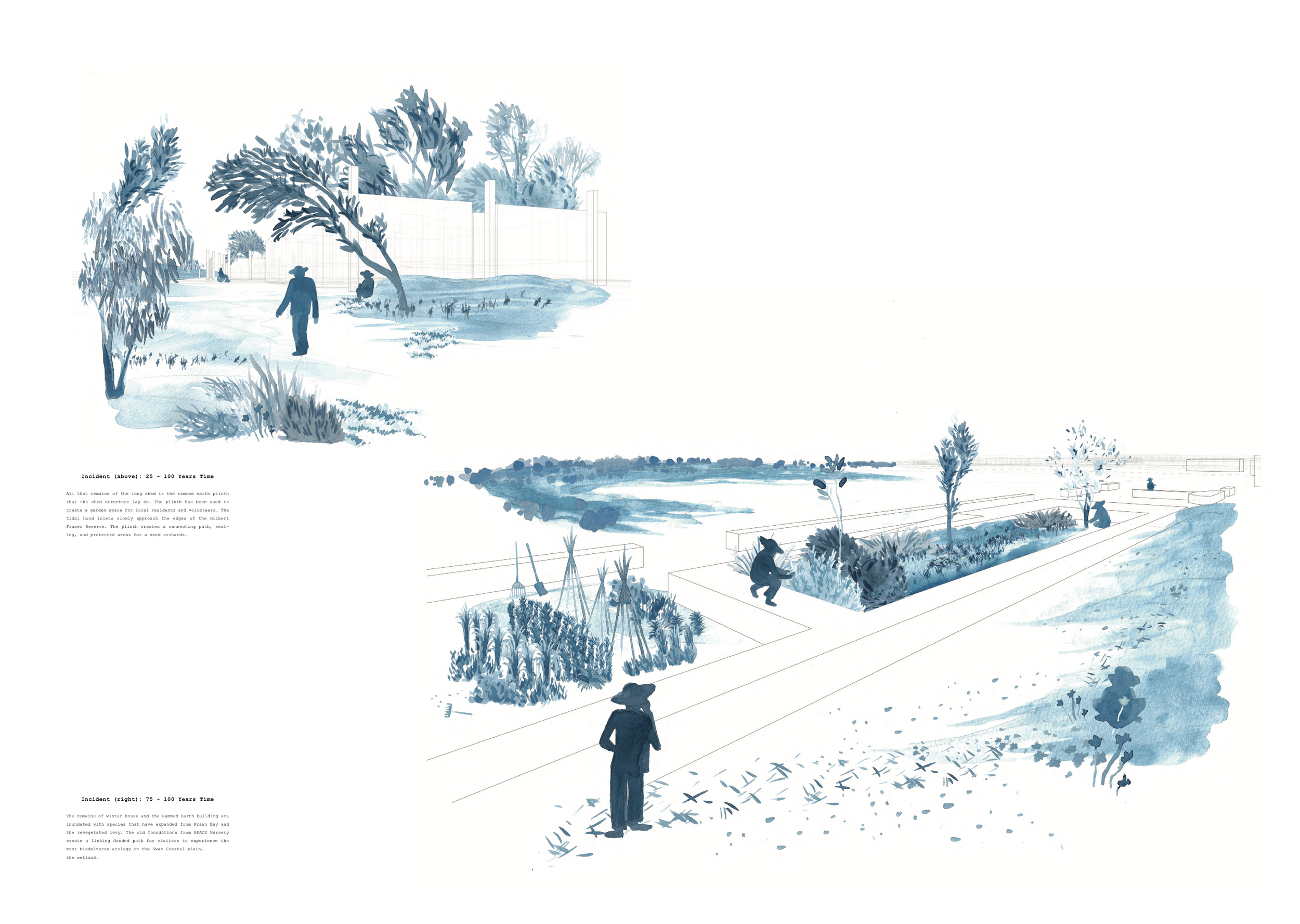 These futures were developed using coordinated social, ecological, and built infrastructure strategies projected across a 100-year timeframe, in response to the predicted flooding of the Derbal Yerrigan. Each scenario included a connecting path, allowing the nursery’s program to function independently on either site——depending on the future APACE chose.
